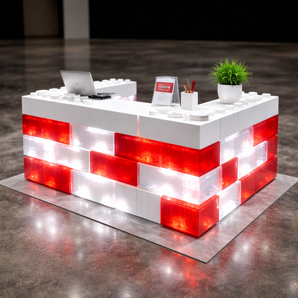 Compact LEGO-Style Counter Booth (Red & White Edition) A compact promotional counter built from oversized LEGO-inspired modular blocks, designed for high visibility and efficient customer interaction in limited spaces. The bold red and white color scheme enhances brand recognition while maintaining a playful yet professional aesthetic. Key Features Compact Counter-Top Footprint — Ideal for high-traffic areas and smaller exhibition spaces. Red & White Modular Blocks — Strong visual contrast for brand prominence. Illuminated Translucent Elements — Integrated lighting enhances attention and booth visibility. Durable Interlocking Structure — Stable and reusable modular construction. Integrated Display Surface — Clean countertop for devices, brochures, or product samples. Rapid Deployment Design — Tool-less assembly and easy transportation. Use Cases Registration counters Product sampling stations Pop-up activations Roadshows Information desks Retail promotion booths Value Proposition A portable, eye-catching engagement point that combines strong branding with practical functionality.