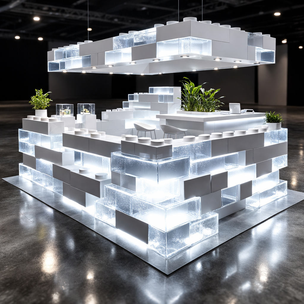 Modular Translucent LEGO-Style Event Booth (Chest-Height Pavilion) A striking architectural event booth constructed from oversized LEGO-inspired modular blocks, designed to create a futuristic and highly visible exhibition presence. The structure combines translucent illuminated elements with clean white modules to form a glowing, contemporary environment suitable for premium brand showcases. Key Features Modular Brick Construction — Built from large, interlocking block units for rapid assembly, disassembly, and reconfiguration. Translucent Light Panels — Frosted blocks with internal LED illumination create a soft ambient glow and high visual impact. Chest-Height Enclosure Design — Open yet structured layout enables engagement while defining booth space. Integrated Counter & Work Area — Functional interior workspace for staff interaction and product display. Floating Canopy Structure (Optional) — Suspended modular top frame enhances brand visibility. Minimalist Modern Aesthetic — Clean white and translucent finish suitable for tech, innovation, and premium brands. Use Cases Trade shows and exhibitions Product launches Tech demonstrations Experience zones Corporate showcase booths Value Proposition Creates a high-end, visually distinctive brand presence while remaining fully reusable and configurable for different events.